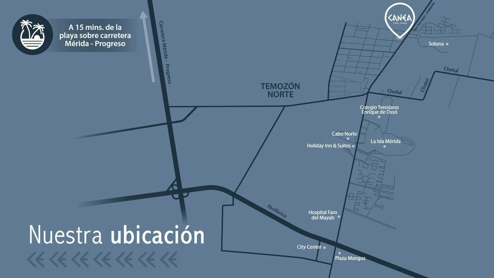 Canea es un complejo de 26 departamentos de 1 y 2 recámaras ubicado en la privilegiada zona con alta plusvalía de Temozón Norte, rodeado de servicios y amenidades como: centros comerciales, supermercados, restaurantes, hospitales, escuelas y farmacias; así como de fácil acceso al interior de la ciudad, el periférico y la carretera Mérida-Progreso.